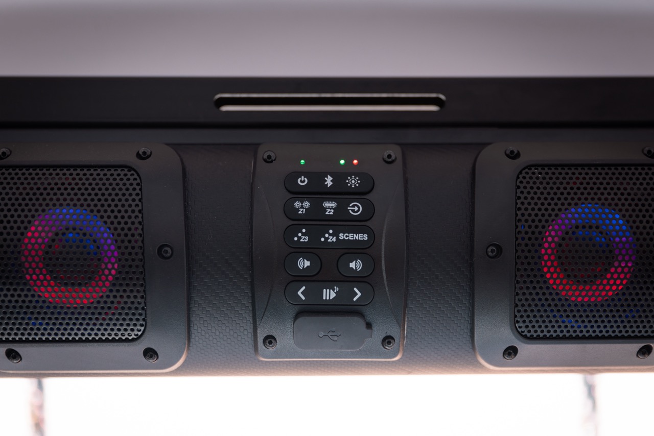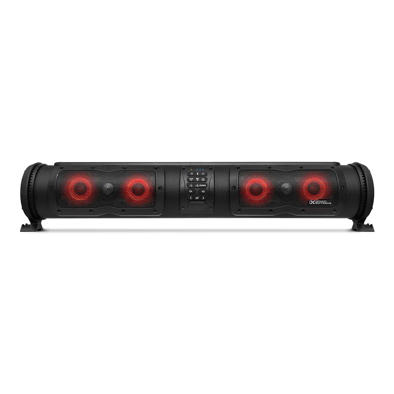 Soundbars are a great choice for those looking for a quick and easy audio installation option. With simple wiring to a 12v battery or a reducer on a lithium pack, soundbars also have multiple mounting options including drill, clamp, or use of a SoundExtreme mounting bracket made for specific models. A soundbar’s positioning can be customized to a user’s preference or model with mounting points including top front roof, rear roof, or middle roof on a six-seater. SoundExtreme also offers a 33” double-sided bar with front and rear facing speakers for a 360’ sound immersion—which is perfect for a middle roof mount. Some people also choose to get creative with hidden mounts between and under seats, on grab bars, or anywhere audio might be desired.